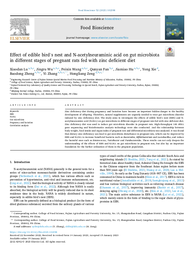 近年來,人們愈發(fā)關(guān)注腸道健康,越來越多的證據(jù)顯示,腸道菌群能夠通過產(chǎn)生菌群代謝產(chǎn)物、影響機(jī)體免疫反應(yīng)、調(diào)節(jié)迷走神經(jīng)及干預(yù)腸內(nèi)分泌系統(tǒng)等多種途徑和神經(jīng)系統(tǒng)相互作用?;诖?,燕之屋聯(lián)合各大高校持續(xù)對(duì)食用燕窩的有益作用展開深入研究。今年1月,燕之屋關(guān)于“Effect of edible bird’s nest and N-acetylneuraminic acid on gut microbiota in different stages of pregnant rats fed with zinc deficient diet(食用燕窩和N-乙酰神經(jīng)氨酸對(duì)低鋅飲食孕鼠不同時(shí)期腸道菌群的影響)”的研究成果被食品科學(xué)領(lǐng)域國(guó)際知名SCI期刊《Food Bioscience》收錄。
