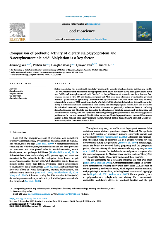 圖:燕之屋燕窩研究院研究論文被國(guó)際權(quán)威期刊《Food Bioscience》收錄