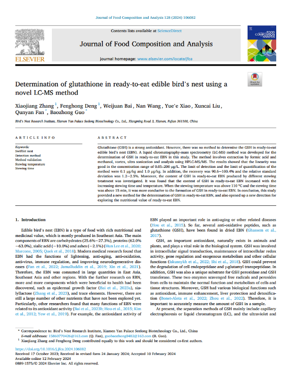 近日,燕之屋在食品科學(xué)領(lǐng)域取得了重大突破,開展的一項(xiàng)題為“Determination of glutathione in ready-to-eat edible bird’s nest using a novel LC-MS method”的研究成果被食品科學(xué)領(lǐng)域國際知名SCI收錄期刊《Journal of Food Composition and Analysis》正式收錄和發(fā)表,證實(shí)了該項(xiàng)研究成果具有科學(xué)性、創(chuàng)新性和可行性,具有推動燕窩行業(yè)的科學(xué)研究和產(chǎn)品創(chuàng)新的巨大潛力。該研究率先建立了一種用于測定即食燕窩中谷胱甘肽含量的液相色譜-質(zhì)譜法(LC-MS),具有準(zhǔn)確、穩(wěn)定、快捷的優(yōu)點(diǎn),能夠?qū)崿F(xiàn)對即食燕窩中谷胱甘肽含量的快速、準(zhǔn)確測定,填補(bǔ)了行業(yè)在該領(lǐng)域的空白。