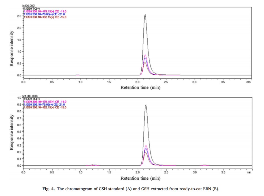 燕窩作為歷史悠久的滋補(bǔ)佳品,深受國人喜愛和追捧。谷胱甘肽是一種重要的抗氧化劑,天然存在于動植物體內(nèi),具有抗氧化、增強(qiáng)免疫、保護(hù)肝臟和解毒等多種生物學(xué)功能(Bonet-Aleta et al., 2022; Zhou et al., 2022)。谷胱甘肽的含量關(guān)系到燕窩的營養(yǎng)價值,因此準(zhǔn)確和科學(xué)的測定燕窩中是否存在谷胱甘肽,以及測定谷胱甘肽的含量顯得尤為重要。