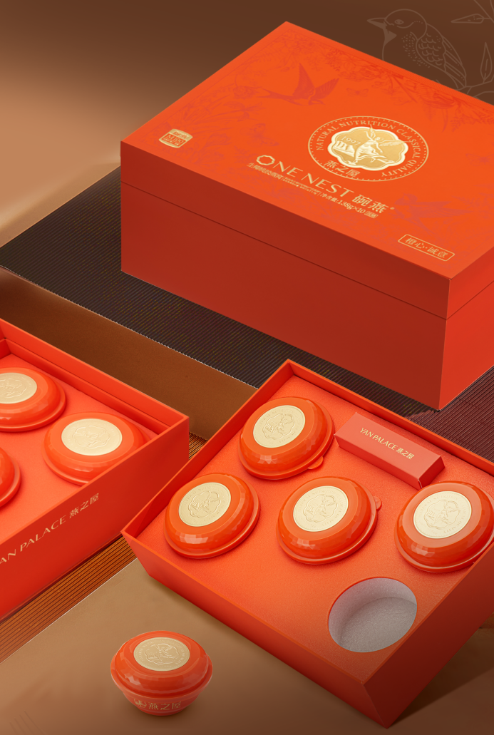 為增強禮盒的創(chuàng)新性與實用性,《碗燕M100·橙意款(橙心·誠意)生椰桃膠燕窩》禮盒內(nèi)部采用雙層式結(jié)構(gòu)設計,使其具有更大的承裝空間。產(chǎn)品擺放合理有序、易于取出,便捷實用。同時,貼心設計勺盒結(jié)構(gòu),精巧美觀,獨具匠心。包裝色彩靈感源自時尚品牌愛馬仕的標志性橙色,高貴神秘、鮮艷明麗,不僅釋放輕奢氣質(zhì)與年輕活力,更向消費者傳達感恩與關愛,希望每個使用者都能在打開包裝時感受到燕之屋品牌真摯的情感關懷。