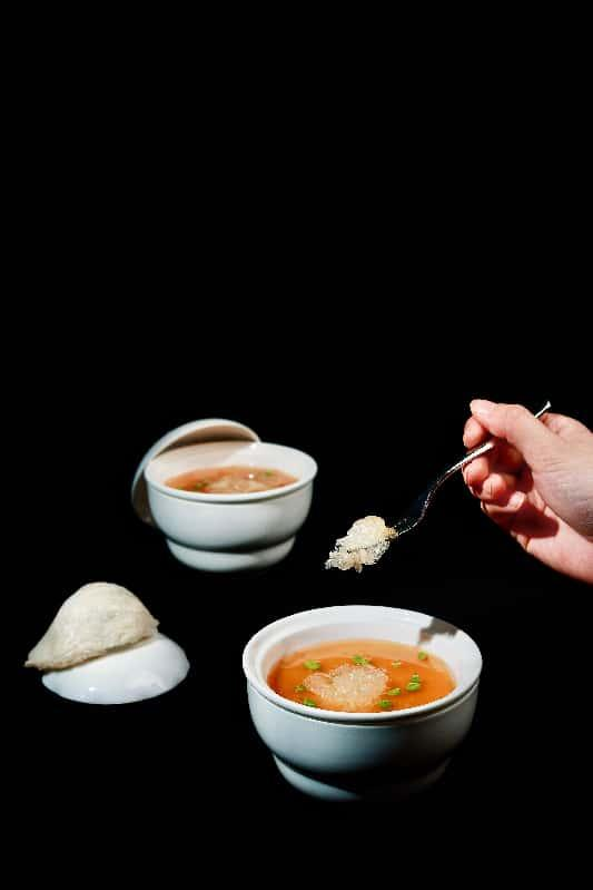 金湯燕窩春卷配香醋,改良傳統(tǒng)春卷技法,以燕之屋清潤燕窩為餡,保證入口酥脆的同時,更添輕盈、爽滑口感,搭配香醋的微酸回甘,呈現(xiàn)豐富味覺層次。以魯菜“炸”技見長的外酥里嫩為靈感,王浩全將其改良為更輕盈的“空氣春卷”,酸、鮮、酥、潤交織成舌尖上的藝術(shù),打破傳統(tǒng)春卷的形態(tài)束縛。