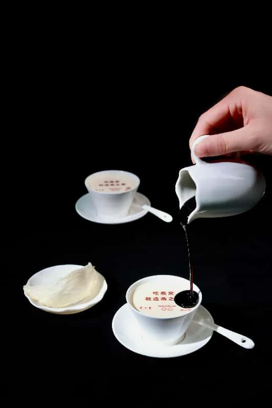 阿膠燕窩發(fā)酵酸奶酪,山東阿膠、燕之屋燕窩與驢奶三種珍稀食材創(chuàng)意融合,經(jīng)24小時發(fā)酵沉淀成絲滑酸奶酪,頂部搭配酒糟阿膠,入口絲滑綿密,透出絲絲膠香,滋養(yǎng)與口感雙重升華。這一款甜品則跳脫中餐語境,是對“滋養(yǎng)”概念最當代表達的寫照,跨越時空的食材協(xié)奏,正是王浩全對“滋補”理念的重釋。